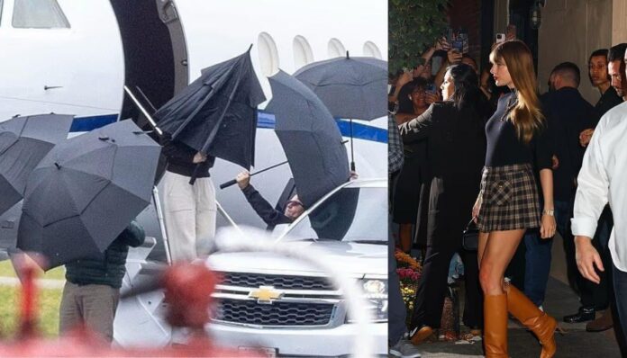Taylor Swift tried to keep a low profile after landing in New Jersey on Sunday, using black umbrellas to block photographers as she stepped off her private plane.