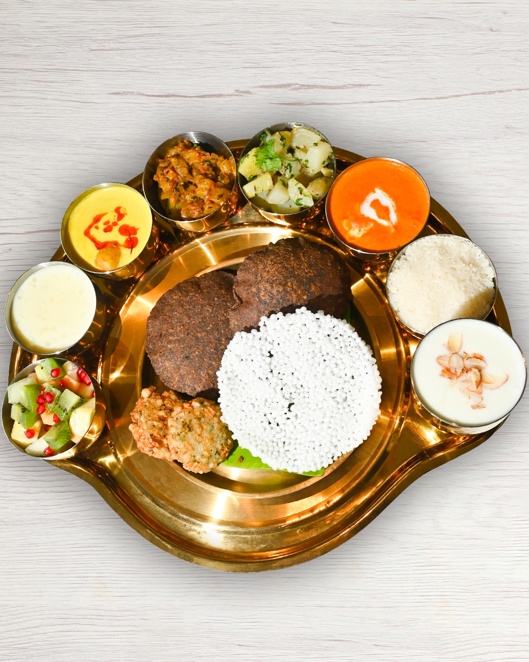 The Navratri Thali features a balanced spread of vrat classics, Aloo Jeera, Paneer in Tomato Gravy, Makhana, Samak Rice, Falahari Poori, Sabudana Kheer, Sabudana Vada, and Papad. Thoughtfully curated and generous in portion, it’s designed to be shared, celebrated, and savoured.