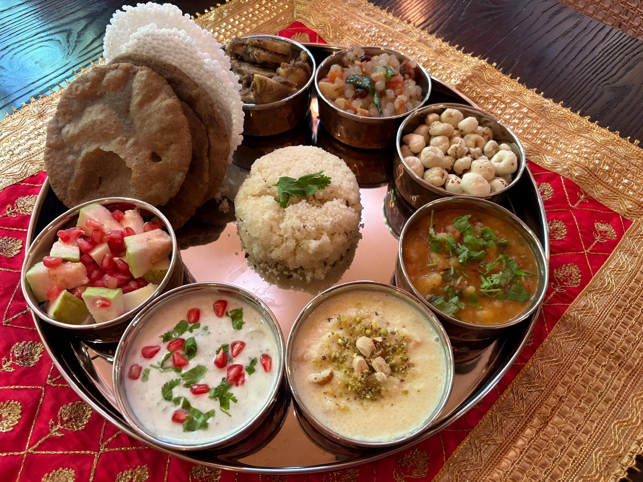 On the platter are traditional favourites including Sabudana Khichdi, Kuttu ke Aate ki Puri, Singhare ke Aate ka Paratha, Samak Rice, Potato Sabzi, and Arbi Sabzi, crafted to reflect the spirit of Navratri. Served for both lunch and dinner with advance booking, the thali offers an experience that blends devotion with indulgence.